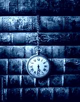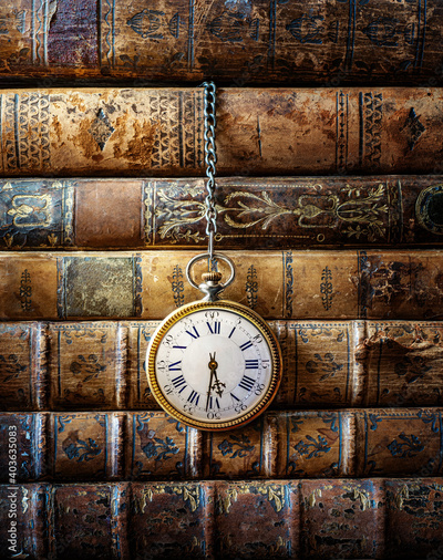 Vintage clock hanging on a chain on the background of old books. Old watch as a symbol of passing time. Concept on the theme of history, nostalgia, old age. Retro style.