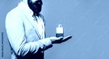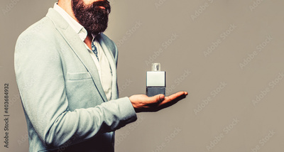 Perfume or cologne bottle and perfumery, cosmetics, scent cologne bottle, male holding cologne. Masculine perfume, bearded man in a suit. Male holding up bottle of perfume. Man perfume, fragrance