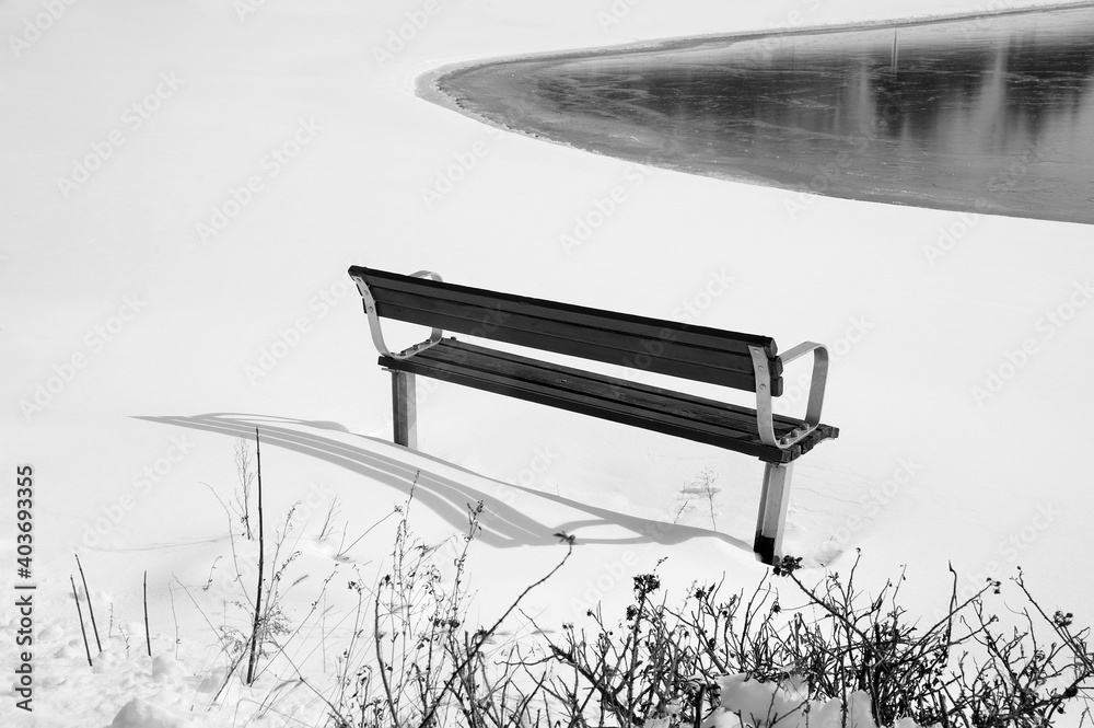 Single empty bench in the snow