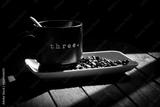 Coffee mugs and coffee beans are placed in a plate and placed on a wooden