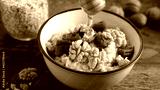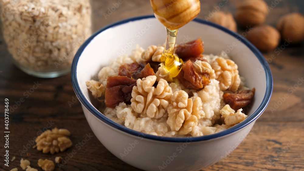 Oatmeal porridge with dried fruits and walnuts and honey. Adding honey to healthy breakfast porridge oats