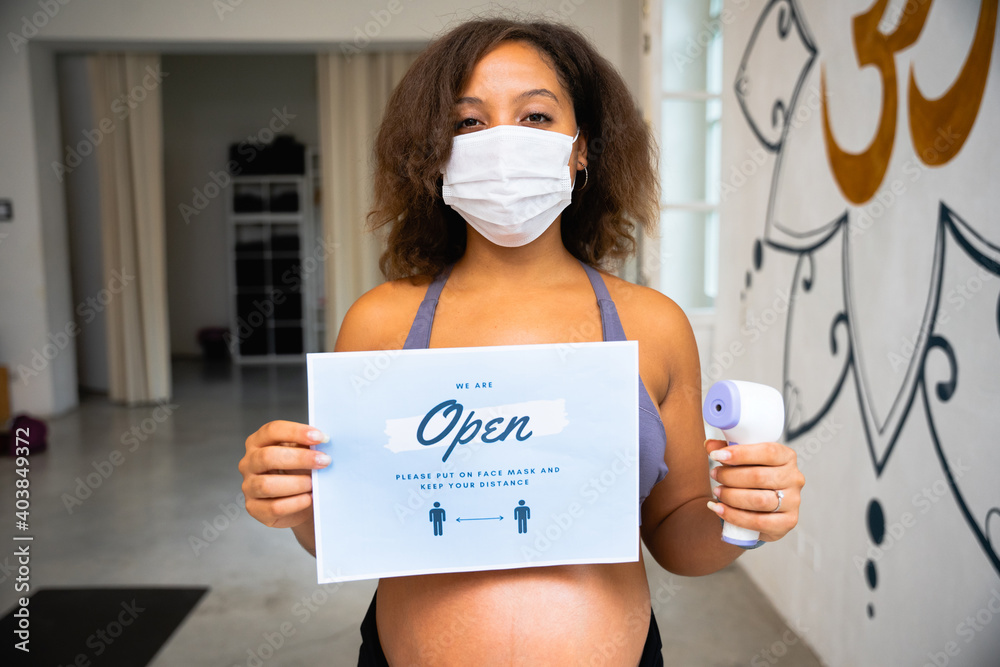 Portrait of beautiful young female teacher and owner in gym with face mask thermometer in hand and sign that says We are open please put on face mask and keep your distance for protection Coronavirus