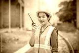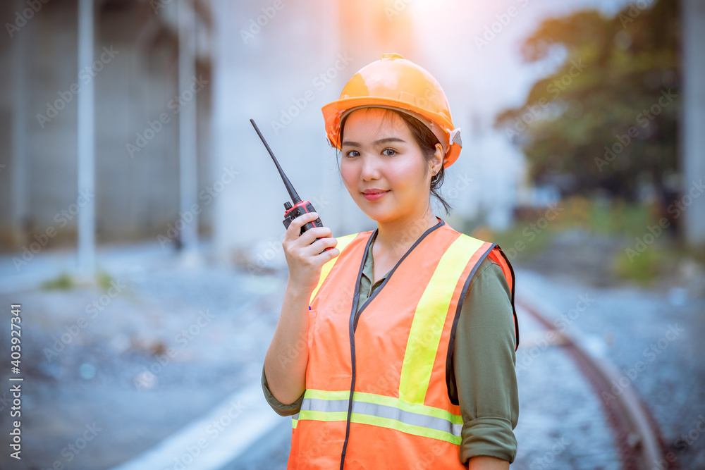 Portrait engineer under inspection and checking construction process railway switch work on railroad station .Engineer wearing safety uniform and safety helmet and radio communication in work.