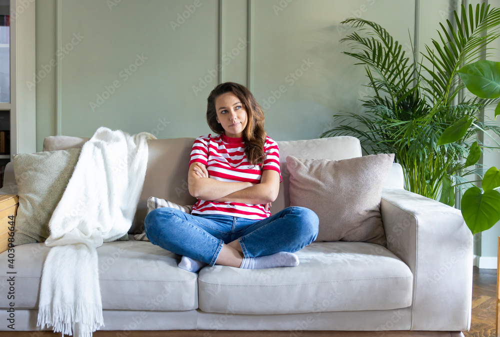 Young woman looking thoughtful while relaxing on the sofa at home.