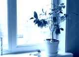 Plant in a pot on the windowsill inside the room. An unhealthy plant with yellowed and fallen leaves. Improper care, illness.