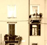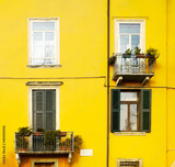 Yellow italian building facade with windows and balconies. Beautiful european historic architecture