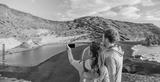 Hikers taking phone phone while walking in mountain landscape banner. Travel couple tourists in Spain on hike. Panoramic of woman, man .