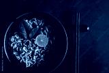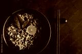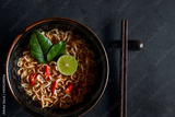 Top view, The instant mama noodles are boiled in a cup on a black marble table.