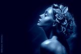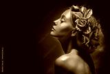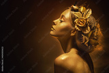 Portrait Closeup Beauty fantasy woman, face in gold paint. Golden shiny skin. Fashion model girl, image goddess. Glamorous crown, wreath roses, jewellery accessories. Professional metallic makeup