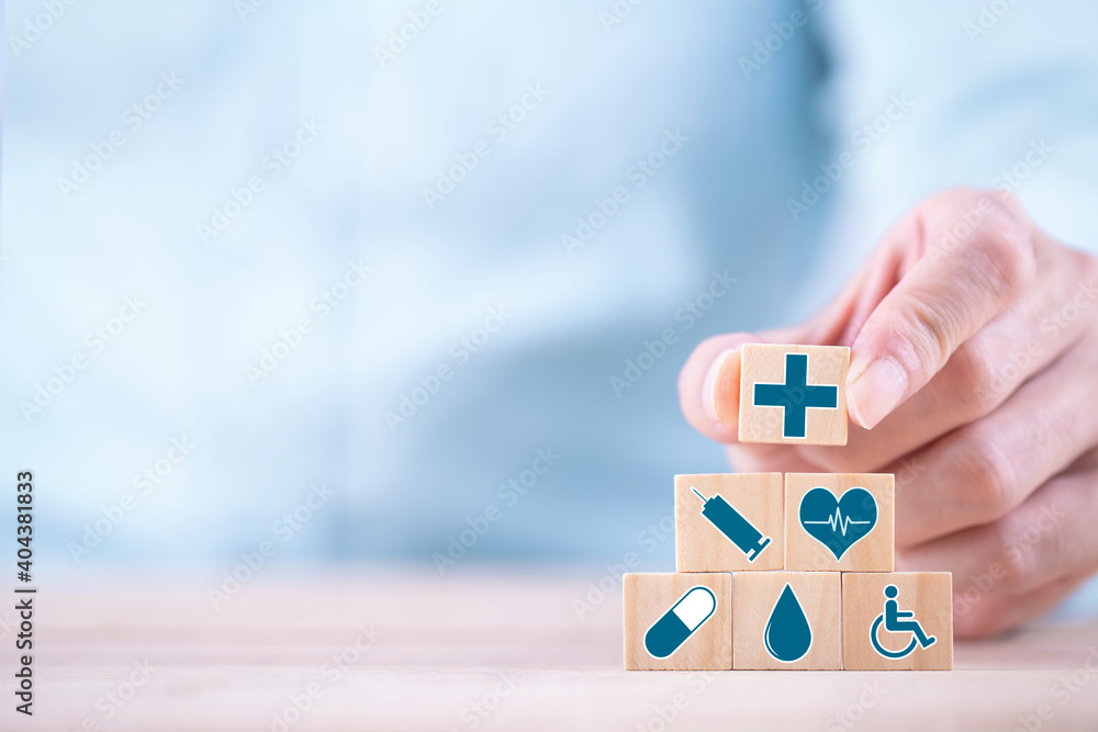 Businessman chooses a emoticon icons healthcare medical symbol on wooden block , Healthcare and medical Insurance concept
