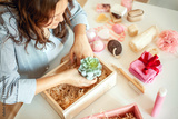 Young woman preparing birthday gift box set of natural bath supplies for body care.