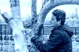 Whitewashing of fruit trees in spring garden. Human hands in gloves holding brush and whitewash bucket close-up. Man gardener whitening trunk of apple tree. Spring work in garden, gardening concept