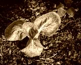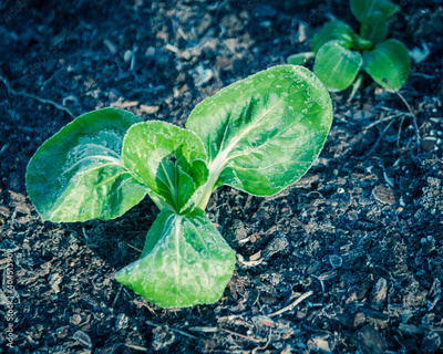 Vintage tone bok choy with frozen leaves in winter backyard garden near Dallas, Texas, USA