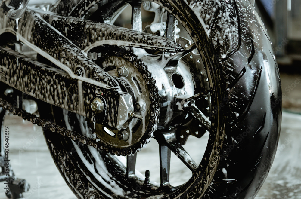Wash the motorbike at the car wash shop. Foam car wash on wheels