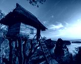 Beautiful sunrise at the famous tourist location the Nusa Penida tree house overlooking the Thousand Islands viewpoint near Bali, Indonesia