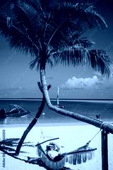 Beautiful young lady in dress sleeping in a hammock and holding hat. Tourist woman enjoys a tropical beach at Bali Indonesia. Blue sky and sunny day at Maldives beach resort. Travel after Covid-19