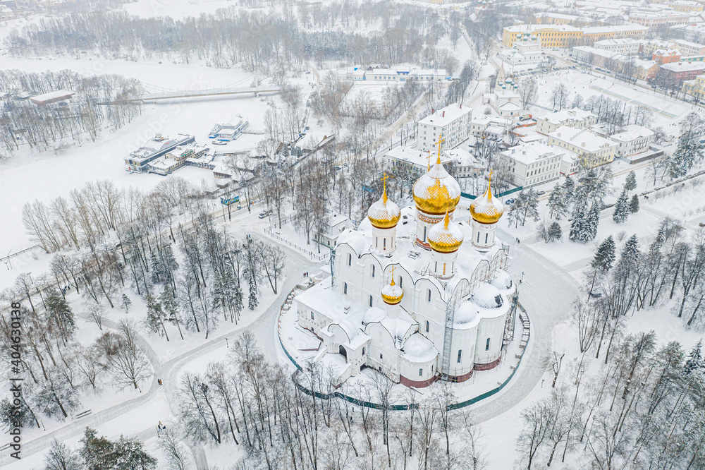 Aerial drone view of the Orthodox Assumption Cathedral during winter in Yaroslavl, Russia. Ancient touristic city of the Golden Ring.