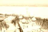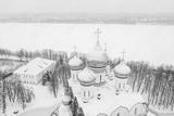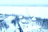 Aerial drone view of the Orthodox Assumption Cathedral during winter in Yaroslavl, Russia. Ancient touristic city of the Golden Ring.