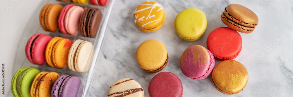Many macarons at bakery in gift box. Panoramic banner of french sweet desserts top view.