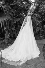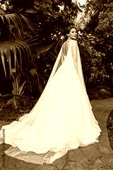 Beautiful sexy woman model bride wearing white long silk and lace wedding dress fashion espousal bright makeup brunette hairstyle ceremony in green summer garden love.