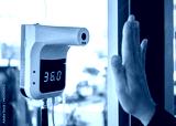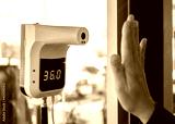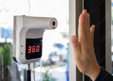 Someone hand trying to measuring temperature before entering to shopping mall by automatic infrared thermometer.