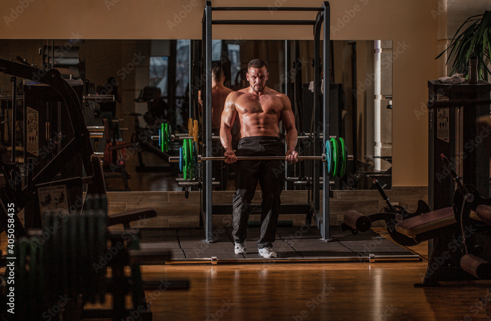 Barbells workout. Bodybuilder athletic man with six pack, perfect abs, shoulders, biceps, triceps, chest. Athletic guy standing with barbell, workout in gym. Muscular man workout with barbell at gym