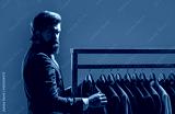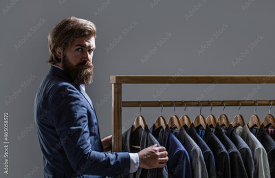 Tailor, tailoring. Men's suit, tailor in his workshop. Elegant man's suits hanging in a row. Luxury mens classic suits on rack in elegant men's boutique