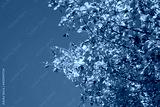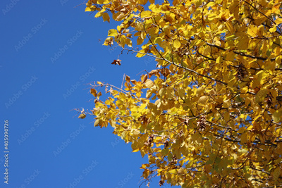 European or common hornbeam with yellow leaves. Carpinus betulus in autumn against blue sky