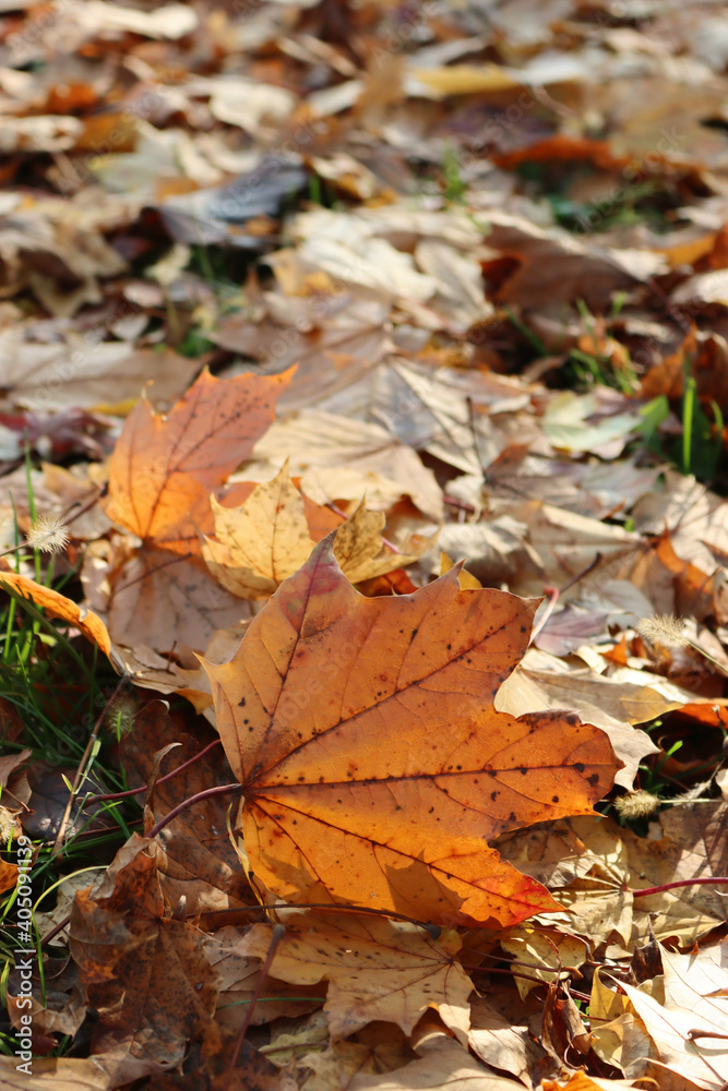 Freshly fallen yellow leaf in the garden. Autumn background
