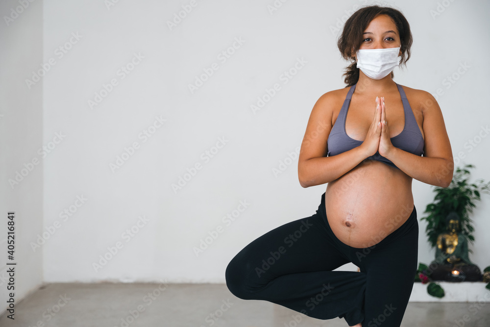 Portrait of a young pregnant woman engaged in yoga exercise during pregnancy wearing face mask to protect herself from Covid-19 infection, Coronavirus