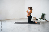 Young pregnant woman trains with yoga in the gym waiting for the birth of her baby - Concept of health and wellness