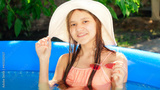 Beautiful msiling teenage girl relaxing in swimming pool and taking off sunglasses. Summer vacation and holidays