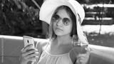 Portrait of beautiful teenage girl drinking cocktail and typing message in social medi on smartphone while swimming in pool at house backyard. Concept of happy summer holidays and vacation