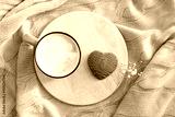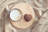 cappuccino cup and heart shape chocolate cookie, breakfast in bed for valentine, flat lay
