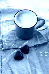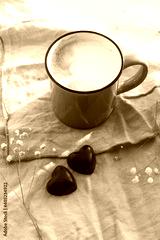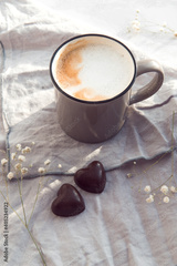 cappuccino cup and heart shape chocolate sweets, breakfast in bed for valentine