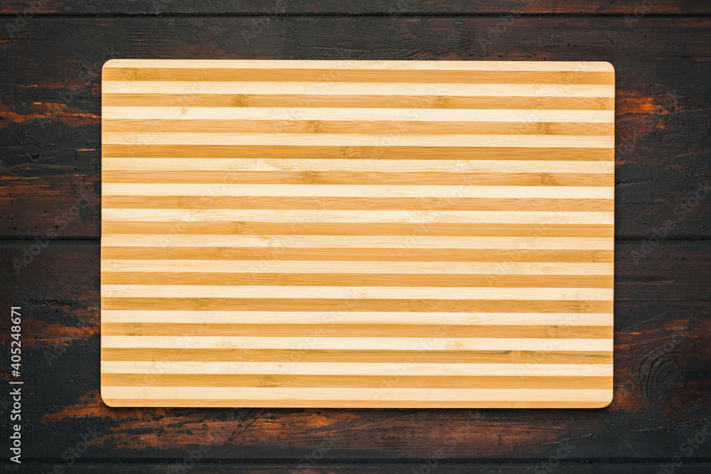 New rectangular wooden bamboo cutting board on dark wooden table background. Top view. Mock up for food project.