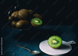kiwi cut in the foreground on a white cutting board, in the background iron bowl with other kiwis, on a dark background