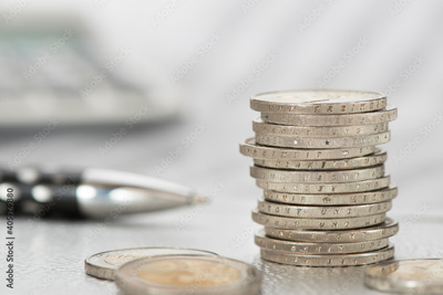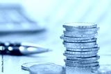 Stapel Euromünzen mit Rechner auf Börsenchart