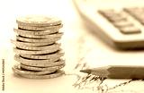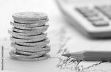 Stapel Euromünzen mit Rechner auf Börsenchart