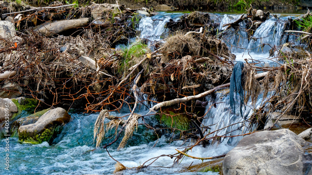 Piles of garbage, sticks and debris lying in mountain river. Concept of ecology disaster