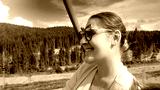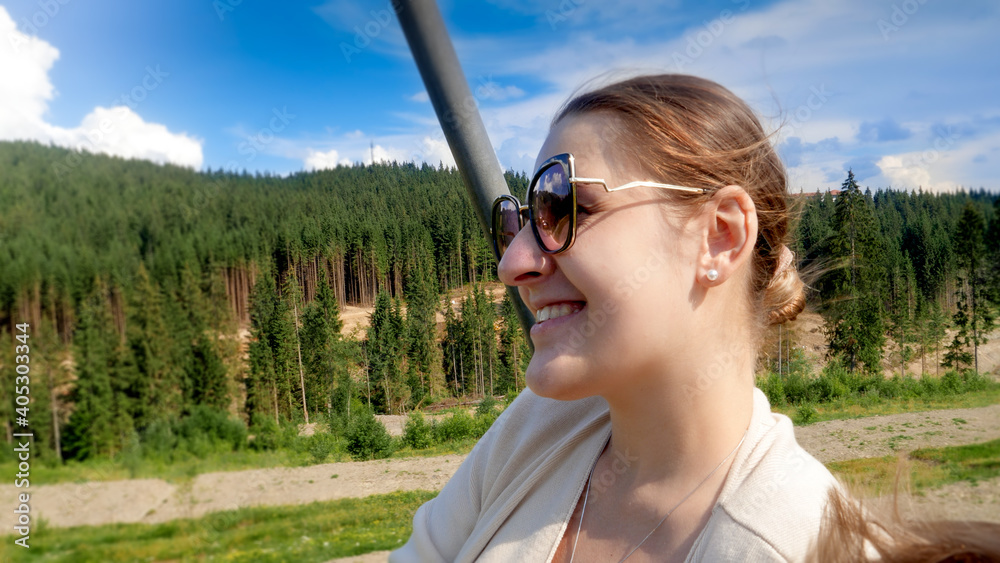 Portrait of happy smiling young woman enjoying ride on ski lift on summer day at mountains. Concept of travel and tourism in mountain at summer