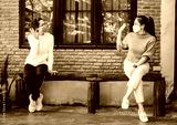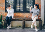 Two Asian woman greeting by waving hands and sitting by keep social distancing for protection virus disease in Covid-19 pandemic.