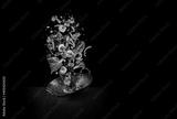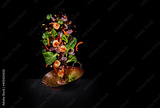 Flying wok ingredients - shrimp, vegetables, pak choi leaves, onions and peanuts. Asian food delivery. Chinese recipes. Wok preparation ingredients. Copy space.