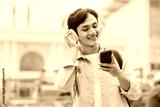 The man is wearing a backpack, listening to music and using the phone
