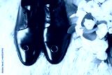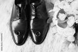 Set of mans fashion shoes with two golden wedding rings and beautiful wedding bouquet with different flowers, roses