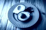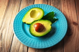 Fresh avocado fruit on a blue plate on wooden table. The concept of healthy eating. Food photography