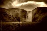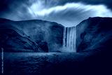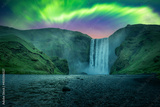 Green aurora light behind famous Skogafoss waterfall on Skoga river. Iceland, Europe. Courtesy of NASA. Photo collage