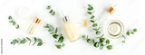 Eucalyptus essential oil, eucalyptus leaves on white background. Natural, Organic cosmetics products. Medicinal plant. Natural Serums. Flat lay, top view.