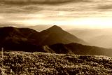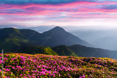 Rhododendron flowers covered mountains meadow in summer time. Purple sunrise light glowing on a foreground. Landscape photography