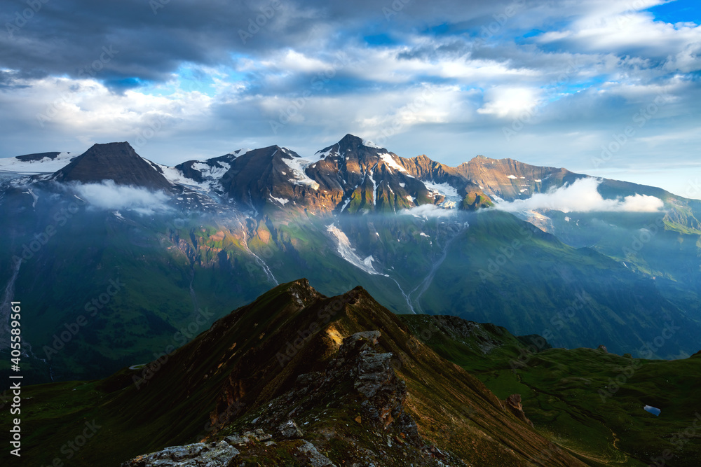 Amazing sunrise on the top of Grossglockner pass, Swiss Alps, Switzerland, Europe. Landscape photography